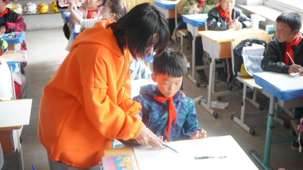 支教学生正在给包家屯中心小学学生上美术课